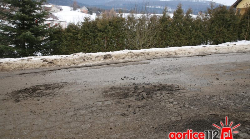 Sami też byliśmy świadkami w jaki sposób najbardziej zniszczony fragment drogi pokonują samochody oraz busy. Pojazd lokalnego przewoźnika, poruszał się z prędkością co najwyżej 3-5 km/h a mimo to tylko podskakiwał i kołysał się na „muldach” wymrożonej warstwy bitumicznej oraz dziurach. Nie łatwiejsze życie mają mieszkańcy, którzy czasami nawet kilka razy dziennie muszą pokonać feralny odcinek drogi. Wyrwy i ubytki w drodze mierzyły w niektórych miejscach nawet 10-20 cm. W takich warunkach dojazd karetki pogotowia może się wydłużyć a co dopiero mówić o bezpiecznym transporcie chorego. Fatalny odcinek drogi, a w zasadzie gruntu po którym jeżdżą jeszcze samochody mierzy około 800-1000 metrów. Zapewne resztki nawierzchni, pokrywające ostatnie metry tej drogi wykruszą się gdy stopnieje obecna warstwa śniegu.